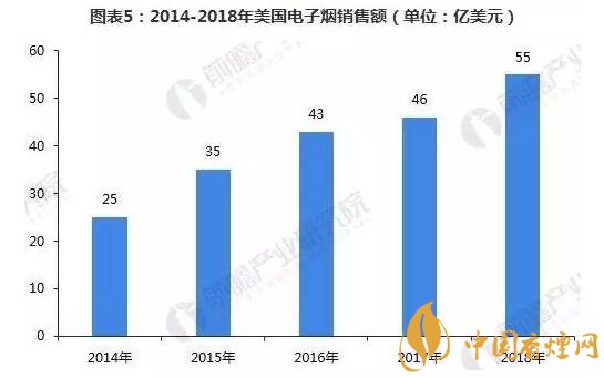 根據(jù)《2017年世界煙草發(fā)展報(bào)告》顯示,北美是第一大電子煙市場(chǎng),而跟據(jù)貝倫貝格銀行發(fā)表的一份報(bào)告稱,美國(guó)已經(jīng)成為世界上新一代產(chǎn)品銷量最大的市場(chǎng)。2014-2017年,美國(guó)電子煙銷售額逐年增長(zhǎng),2017年增長(zhǎng)至46億美元。而2017年全球電子煙銷售額約為100億美元,美國(guó)就占了近50%的市場(chǎng)份額。預(yù)計(jì)2018年美國(guó)電子煙銷售額將達(dá)到55億美元。