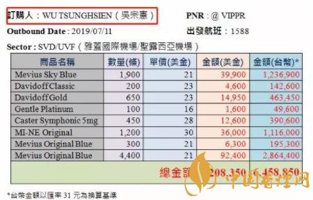 除此之外,黃國(guó)昌還貼出一張“訂購(gòu)單”圖片,其中顯示“訂購(gòu)”內(nèi)容為八種香煙,金額總計(jì)6458850元新臺(tái)幣,還標(biāo)注了航班、日期、機(jī)場(chǎng)等信息,而“訂購(gòu)人”一欄還清楚寫著“吳宗憲”的大名。