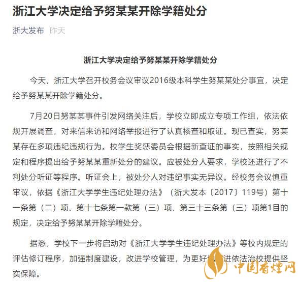 浙大表示,現(xiàn)已查實,努某某存在多項違紀違規(guī)行為。浙大學生獎懲委員會根據(jù)新查證的事實,按照相關(guān)規(guī)定和程序提出給予努某某重新處分的建議。應被處分人要求,學校還進行了不利處分聽證等程序。聽證會上,被處分人對違紀事實無異議。經(jīng)浙江大學校務會議慎重審議,依據(jù)《浙江大學學生違紀處理辦法》(浙大發(fā)本〔2017〕119號)相關(guān)規(guī)定,決定給予努某某開除學籍處分。