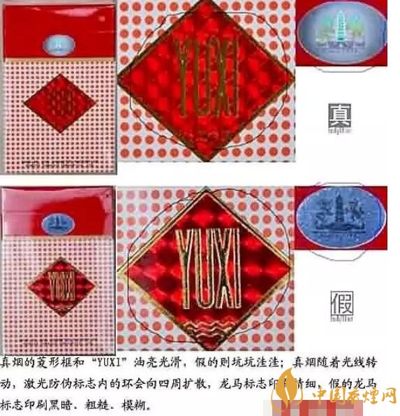 2.外包裝上的“YUXI”標(biāo)識(shí),真的玉溪煙該標(biāo)識(shí)從不同角度觀察,呈現(xiàn)出不同的圖形,且?guī)缀螆D形完整,邊緣規(guī)則整齊;反之則為假煙。