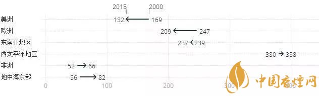 按世界衛(wèi)生組織所劃分地域的2015年與2000年吸煙人數(shù)變化對(duì)比: