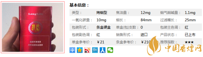 長壽香煙紅的售價為21元/包,特別的烤煙味道,它和國內的這些21元檔的香煙完全不是一個概念。