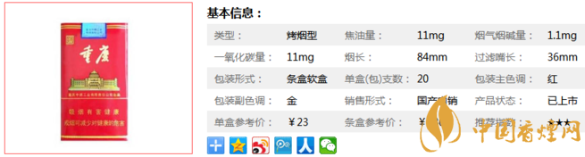重慶紅香煙,煙長84mm,過濾嘴長:36mm,焦油量11mg,采用濾嘴通風(fēng)技術(shù),有效降低了煙氣中有害物質(zhì)的含量,順應(yīng)了目前降焦減害的發(fā)展方向。味道醇淡順口,比較合口味,總得來說很不錯(cuò),煙燃燒很好,口感一般,偶爾抽抽還是可以。