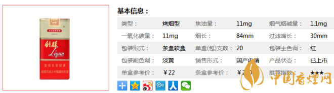 類(lèi)型 :烤煙型 焦油量 :11mg 煙氣煙堿量 :1.1mg 一氧化碳量 :11mg