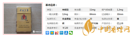 類型 :烤煙型 焦油量 :11mg 煙氣煙堿量 :1.2mg 一氧化碳量 :12mg
