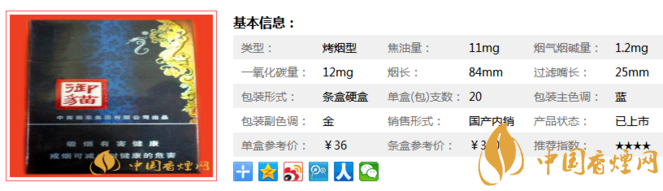 類(lèi)型 :烤煙型 焦油量 :11mg 煙氣煙堿量 :1.2mg 一氧化碳量 :12mg