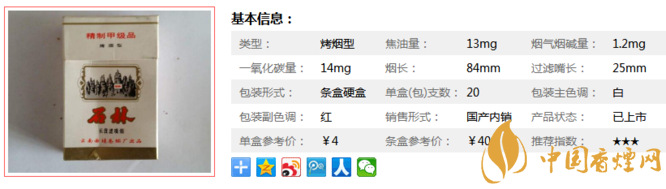 石林硬香煙,煙支長(zhǎng)84mm,在開發(fā)過程中,經(jīng)與國(guó)外有實(shí)力的知名香料公司多次進(jìn)行合作研究,研發(fā)試驗(yàn)200多次,最賦予該產(chǎn)品獨(dú)特的加香加料風(fēng)格。下面我們一起來看石林硬的參數(shù)信息:焦油量:13mg 煙堿量:1.2mg 一氧化碳量:14mg.