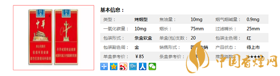 | 煙長(zhǎng):75mm | 過(guò)濾嘴長(zhǎng):25mm | 包裝形式:條盒軟盒 | 單盒(包)支數(shù):20 |