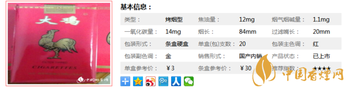 大雞富貴味道比較醇厚,但是新品大雞總感覺欠缺點(diǎn)什么,但也品不出原來大雞煙的味道,也就包裝有些懷舊。大雞這個(gè)煙,名字好,含義好,大吉大利,06年退市,現(xiàn)在又重出江湖了。經(jīng)香煙網(wǎng)小編市場(chǎng)調(diào)查大雞富貴售價(jià)為3元/包。