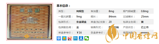 | 煙長:84mm | 過濾嘴長:30mm | 包裝形式:條盒軟盒 | 單盒(包)支數(shù):20 |