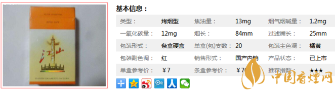 “江山”牌低危害卷煙通過科學的配方手段;利用先進的添加技術,添加了大量的名貴中草藥提取液,每支煙中含有0.5%的“仙芪補腎顆粒”新型料液,它是由精選的淫羊藿、白芍、仙茅、黃芪、柴胡等多味中草藥嚴格按照現(xiàn)代制藥技術精練濃縮而成下面我們一起來看江山精品的參數(shù)信息:焦油量:13mg. 煙堿量:1.2mg. 一氧化碳量:12mg.