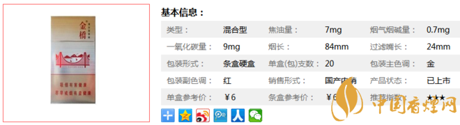 金橋硬的焦油為8mg,基本符合現(xiàn)在國際混合煙品的走向。同樣為8mg的焦油,同樣為6塊的價(jià)格,硬金橋幾乎沒有對手,這也造就了它,為什么那么受歡迎的原因。下面我們一起來看金橋硬的參數(shù)信息:焦油量:7mg. 煙堿量:0.7mg. 一氧化碳量:9mg.