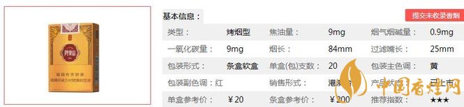 | 類型 :烤煙型 | 焦油量 :9mg | 煙氣煙堿量 :0.9mg | 一氧化碳量 :9mg |