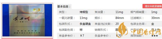 類型 :烤煙型 焦油量 :11mg 煙氣煙堿量 :1mg 一氧化碳量 :13mg