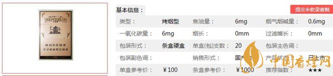 | 類型 :烤煙型 | 焦油量 :6mg | 煙氣煙堿量 :0.6mg | 一氧化碳量 :6mg |