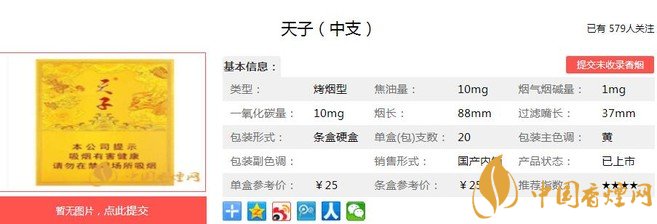 以上便是由小編為大家介紹的關(guān)于天子(中支)的相關(guān)信息。品味一番后,小編也就不奇怪天子(中支)的好評(píng)率了。一個(gè)產(chǎn)品自身過(guò)硬,總是不缺伯樂(lè)的。想要了解更多內(nèi)容請(qǐng)點(diǎn)擊:雪蓮細(xì)支1960多少錢(qián)一包 雪蓮細(xì)支1960口感及參數(shù)介紹