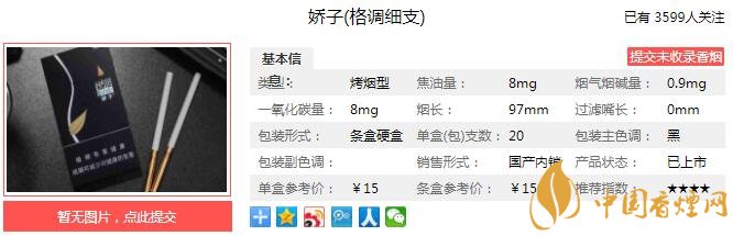 嬌子格調(diào)細支煙支長97mm,過濾嘴長32mm,通過遴選涼山煙葉配以其他優(yōu)質(zhì)煙區(qū)煙葉,結(jié)合多項增香保潤自主專利技術(shù),在清潤厚甜的煙香中凸顯了返璞歸真的原煙本香,賦予了其與眾不同的“清甜香格調(diào)”。下面我們一起來看嬌子格調(diào)細支的參數(shù)信息:焦油量:8mg 煙堿量:0.9mg 一氧化碳量:8mg