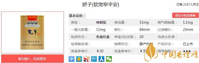 以上便是香煙網小編為大家介紹的關于嬌子寬窄平安價格30元一包,傳承寬窄系列的口感!的相關信息,看完之后大家是不是對于嬌子(寬窄平安)的相關信息更加了解呢。大家還想查詢更多的相關內容歡迎點擊:嬌子寬窄好運細支多少錢一包 寬窄好運細支口感分析