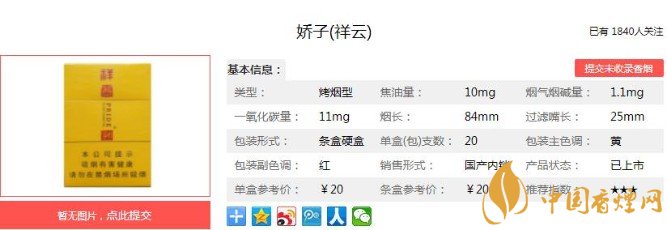 以上便是香煙網(wǎng)小編為大家介紹的關于祥云嬌子多少錢一包,祥云嬌子價格20元一包的相關信息,看完之后大家是不是對于嬌子(祥云)這款香煙的相關信息更加了解呢。大家還想查詢更多的相關內(nèi)容歡迎點擊:嬌子寬窄平安價格30元一包,傳承寬窄系列的口感!