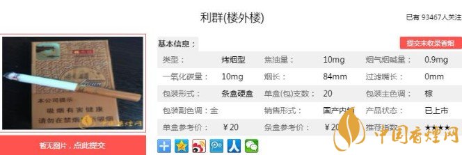 以上便是香煙網小編為大家介紹的關于利群樓外樓多少錢一包 利群樓外樓價格及口感分析的相關信息,看完之后大家是不是對于利群(樓外樓)這款香煙的相關信息更加了解呢。大家還想查詢更多的相關內容歡迎點擊:利群休閑系第一款細支高價煙,僅僅是官方報價就達到了100元一包!
