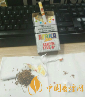 這款煙的外包裝除了有惡心的忠告圖意外,還是比較漂亮的。煙盒下方標(biāo)有“AFRICARANDOMFIVE”煙盒上方是忠告圖吸煙有害健康的一些標(biāo)語。