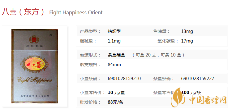 “八喜”煙是山東青州卷煙廠93年推出了“南有紅塔山,北有八喜煙”的促銷宣傳口號,推出了“八喜”香煙。1996年榮獲全國名優(yōu)卷煙"一等品"殊榮,1999年被評為山東八大名牌之一。