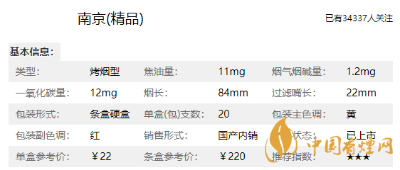 “南京”牌香煙創(chuàng)牌于50年代中期。1956年公私合營(yíng)勤豐煙廠生產(chǎn)南京第二代,1965年國(guó)營(yíng)南京卷煙廠推出南京第三代,1982年又改進(jìn)推出南京第四代,90年代南京卷煙廠推出南京第五代,收到市場(chǎng)的廣泛認(rèn)可。這款煙,零售價(jià)為22元/包。