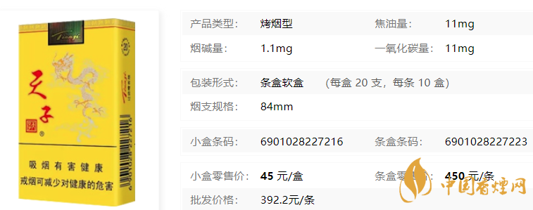 通過上面的介紹,2020天子(軟黃)香煙多少錢一包以及最新天子(軟黃)香煙價格表圖大家都了解了,它定位高端,吸味好,持灰更是讓人刮目相看,超值的一款香煙。了解更多香煙相關(guān)咨詢,請關(guān)注香煙網(wǎng)。