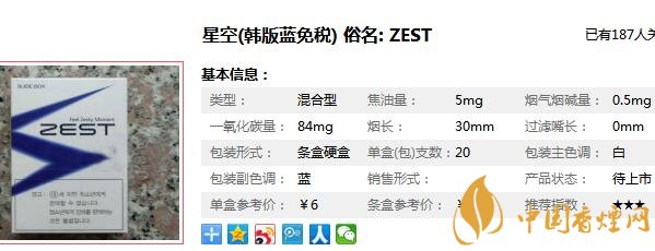 ZEST(星空)是韓國的香煙品牌,是薄荷口味的香煙,煙氣也不太香,薄荷味比較濃郁,但是包裝非常的小清新,比較適合年輕人,下面在對星空香煙價格表分析之前,先來看一看星空香煙多少錢一包,星空香煙的價格在10到15元之間,下面就來對這款香煙價格進行一個具體的分析。