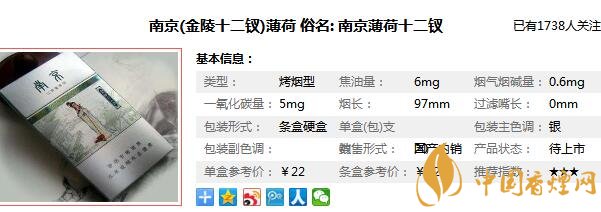 南京卷煙是江蘇中煙南京卷煙廠的代表品牌,而南京薄荷味香煙就是南京(金陵十二釵)薄荷,“金陵十二釵”香煙由南京卷煙廠在1988年出品,是非常少見(jiàn)的12包裝成套系列的產(chǎn)品,在煙標(biāo)收藏界,這套融詩(shī)、書、畫于一體的“金陵十二釵”被視為設(shè)計(jì)最精美的煙標(biāo),那么在對(duì)南京薄荷味香煙價(jià)格圖片分析之前,先來(lái)看看這款南京薄荷味香煙多少錢,它的售價(jià)為22元/包。