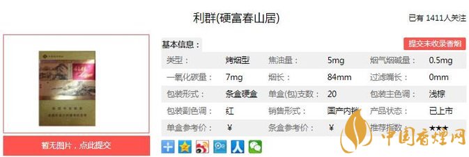 利群硬富春山居煙支長84mm,過濾嘴長不詳,杭州富春江畔之自然人文氣韻產(chǎn)品采用浙江新昌稀有香料煙葉配方調(diào)制,以多門獨(dú)有技術(shù)實(shí)現(xiàn)不加香不加料富春山居利群:純煙葉打造 華夏第一支。下面我們一起來看利群硬富春山居的參數(shù)信息:焦油量:5mg 煙堿量:0.5mg 一氧化碳量:7mg