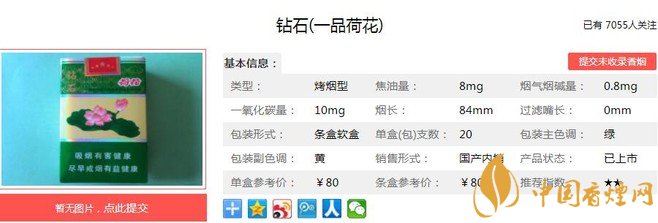 鉆石一品荷花于2014年上市,在高端卷煙市場占用很大的份額,濃淡適中的香氣,勁頭適中成為很多人的口糧。清雅脫俗的包裝設(shè)計(jì)更讓人愛不釋手,經(jīng)香煙網(wǎng)小編市場調(diào)查鉆石一品荷花售價(jià)為80元/包。
