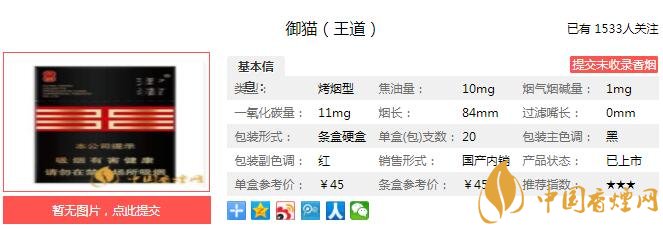成熟、渾厚、自然的煙草本香結(jié)合甜香韻、果香韻、花香韻和酒香韻,協(xié)調(diào)統(tǒng)一,自然天成。煙香成熟、優(yōu)雅、厚實、純凈、細膩、豐富;吃味飽滿、純凈、自然;回味津潤、回甜、舒適、干凈。經(jīng)香煙網(wǎng)小編市場調(diào)查御貓王道售價為45元/包。