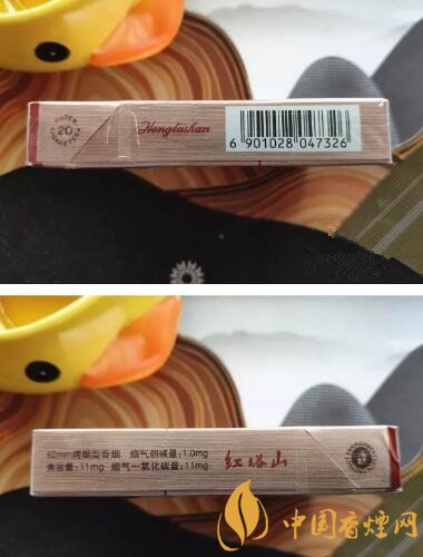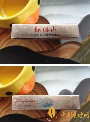 頂部除了紅色的紅塔山字樣外,多了一行“中國稅收未繳專供出口”,明顯的提示這是一款專供出口的香煙;底部是一處銀色反光的貼紙,一定角度下可以看到貼紙里有紅塔山的圖案。
