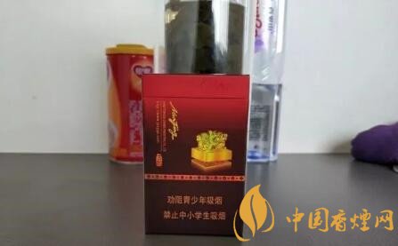 盒子的中間,一顆金黃色的玉璽,顯示了它的尊貴的身份,玉璽圖案的右邊是一枚仿古的印章,內(nèi)有“古都”兩個(gè)字,在圖案的下面是好像是一條鑲著寶石的腰帶。煙盒下面三分之一的面積,按照慣例還是警示語標(biāo)識(shí),警示語為本公司提示版,屬于比較新的一款。