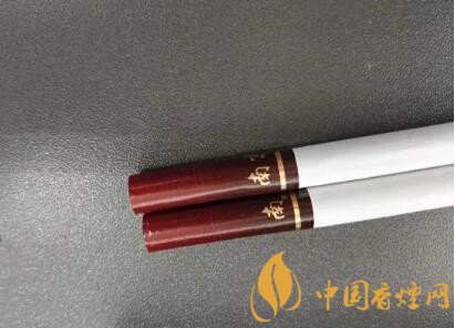 從盒子里面抽出兩支煙來,放置于桌上,觀之,煙嘴的顏色和煙盒的顏色也是一樣,采用了漸變色,紅褐色的煙嘴中間有兩排不怎么明顯的降焦孔。煙嘴的長(zhǎng)度為32毫米,而整個(gè)煙支的長(zhǎng)度還是普通的84毫米。煙嘴下部有南京二字和印有古都兩個(gè)字的印章圖案。一道閃閃發(fā)光的金箍環(huán)繞著整個(gè)煙嘴。