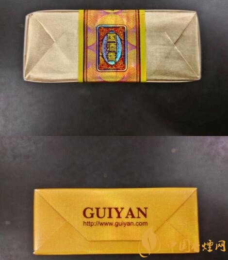 頂部可見內(nèi)襯紙為淺金色,彩色的國酒香封簽條亦是顯得比較活潑。底部則印著貴煙的拼音與網(wǎng)址。
