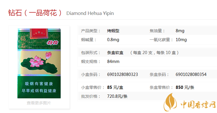 鉆石一品荷花于2014年上市,在高端卷煙市場占用很大的份額,濃淡適中的香氣,勁頭適中成為很多人的口糧。清雅脫俗的包裝設計更讓人愛不釋手,經(jīng)香煙網(wǎng)小編市場調查鉆石一品荷花售價為80元/包。