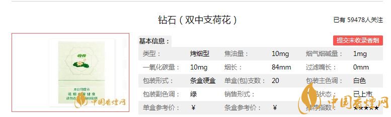 鉆石(雙中支荷花)定價為55元/包。作為鉆石的高檔中支煙,外觀方面非常成功,價格也不是很貴。
