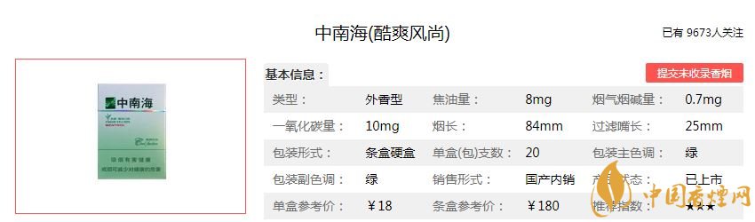 中南海香煙是國內(nèi)首個低焦含量的香煙品牌,旗下的香煙品種很多,不僅用于內(nèi)銷,很多香煙還對外出口,是國內(nèi)目前最為暢銷的香煙品牌之一。中南海酷爽風尚屬于典型的外香型香煙,外觀清新淡雅,突出與口感結(jié)合的清涼之意。