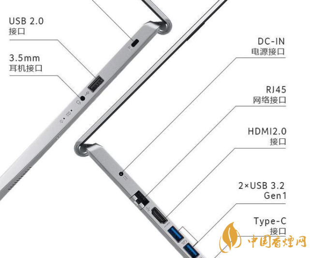 在接口方面,這款筆記本還是比較豐富的,主要的接口有1個全功能的type-c,2個usb3.2 Gen1,1個usb2.0,1個rj45網(wǎng)線接口,1個耳麥接口,1個HDMI2.0,詳細的接口圖如下:
