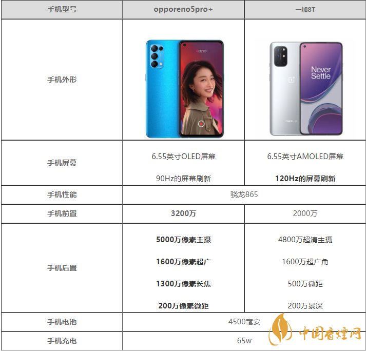 opporeno5pro+采用的是6.55英寸OLED屏幕,是一款90Hz的屏幕。一加8T采用的是6.55英寸AMOLED屏幕,為用戶帶來今年最好的直板柔性屏幕,支持120Hz的屏幕顯示