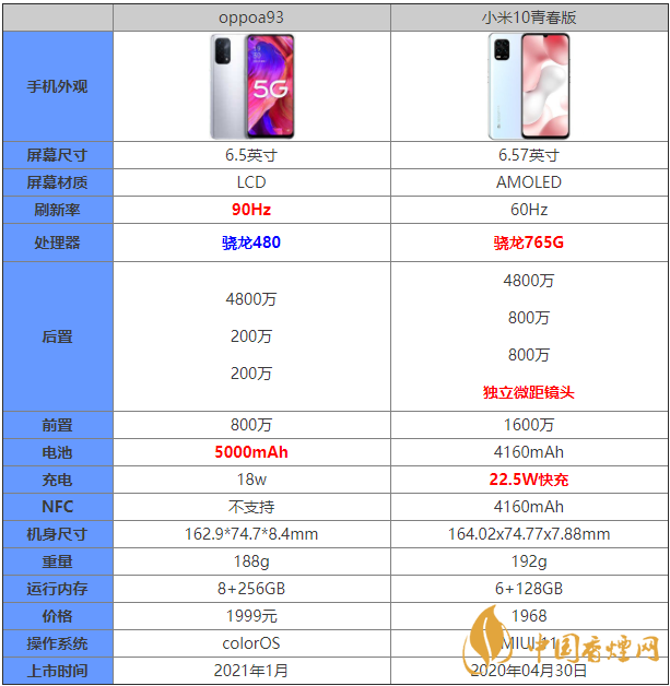 oppoa93和小米10青春版哪個(gè)好?這兩款手機(jī)價(jià)位都在千元機(jī)的范疇,那么oppoa93和小米10青春版有什么區(qū)別?哪款手機(jī)更值得入手?接下來(lái)香煙網(wǎng)小編為大家?guī)?lái)了oppoa93和小米10青春版對(duì)比詳情,感興趣的朋友一起來(lái)看看吧!