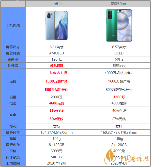 小米11作為今年最強(qiáng)機(jī)型,許多小伙伴對(duì)這款手機(jī)都十分關(guān)注,那么這款手機(jī)和榮耀30pro這兩款手機(jī)的區(qū)別是什么?哪款手機(jī)更值得入手?下面香煙網(wǎng)小編為大家?guī)?lái)最新的小米11和榮耀30pro參數(shù)對(duì)比,感興趣的朋友快來(lái)看看吧。