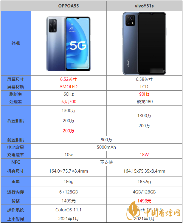 OPPOA55:采用6.52英寸AMOLED屏幕,水滴屏中央挖孔設(shè)計,分辨率2400x1080像素,屏幕刷新率60Hz