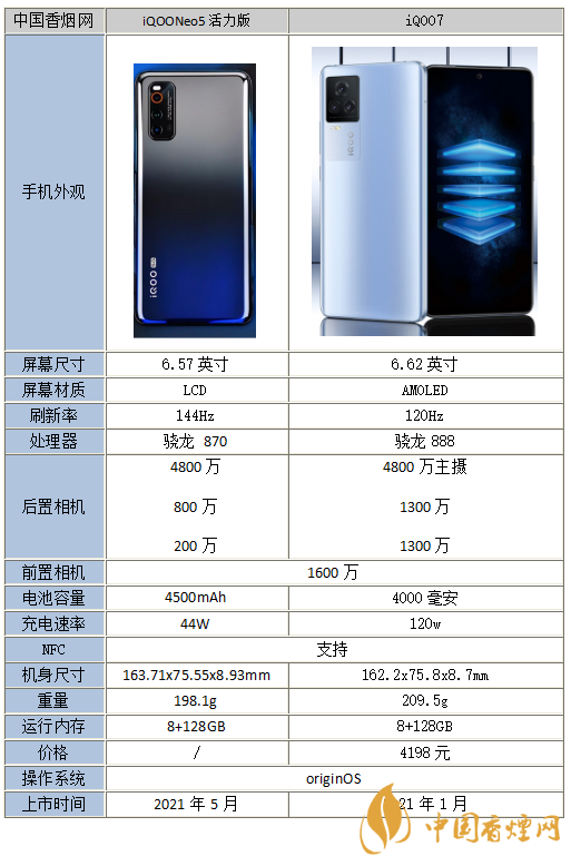 以上就是小編收集到的iQOONeo5活力版和iQOO7哪個(gè)更好-性能參數(shù)對(duì)比分析的相關(guān)內(nèi)容,以上內(nèi)容均來源于網(wǎng)絡(luò),僅供參考,一切以實(shí)際為準(zhǔn),更多最新數(shù)碼資訊請(qǐng)關(guān)注香煙網(wǎng)。