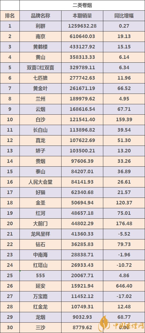 在二類煙品牌銷量的TOP30中,我們看到了品牌之間此消彼長的競爭態(tài)勢,不過從總體來看,這一價位區(qū)間的總體呈現擴容態(tài)勢。利群品牌依然保持著在二類煙市場上的頭號優(yōu)勢,縱然增幅不高,但是基數龐大,哪怕0.1%的增長也是不小的成績。