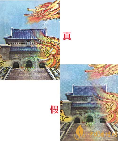 真煙小盒正面天空波浪紋、中山陵屋頂瓦片清晰連貫;假煙小盒正面天空波浪紋、中山陵屋頂瓦片模糊不清,時有時無。