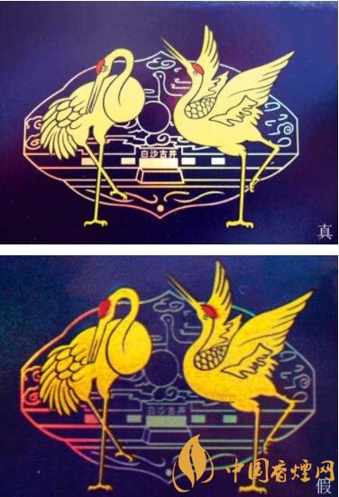 真煙的logo印刷套色分明,圖案上的鶴嘴尖部上長(zhǎng)下短,頭頂部紅黃色層套色均勻細(xì)致,眼睛栩栩如生,“白沙古井”字體粗細(xì)一致、飽滿(mǎn),整體未見(jiàn)顏色圖層重復(fù)、錯(cuò)位情況;假煙的logo印刷顏色死板,圖案上的鶴嘴部上下長(zhǎng)短幾乎一致,鶴頭頂部紅黃色層套色有明顯錯(cuò)位,眼部線(xiàn)條粗細(xì)不一、且因套色錯(cuò)層導(dǎo)致眼睛看上去無(wú)神,“白沙古井”字體粗細(xì)不一、印刷線(xiàn)條偏細(xì),顏色圖層有重復(fù)、錯(cuò)位情況。