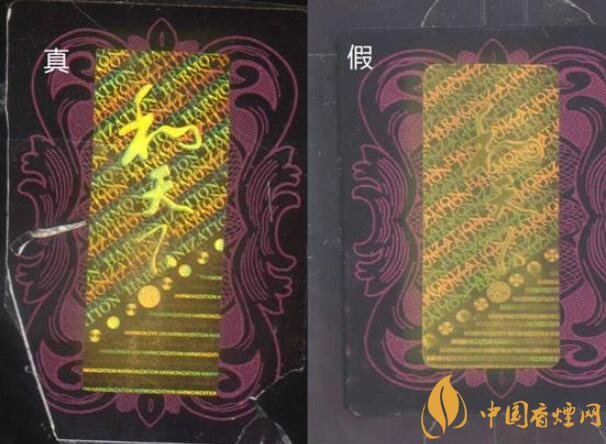 真煙“和天下”立體感強(qiáng),字體筆畫較粗用放大鏡看“HARMONIZATION”微縮字較清晰;假煙的全息防偽無立體感,用放大鏡看“HARMONIZATION”微縮字較模糊,且“和天下”字體筆畫較細(xì),與真品特征存在明顯差異。